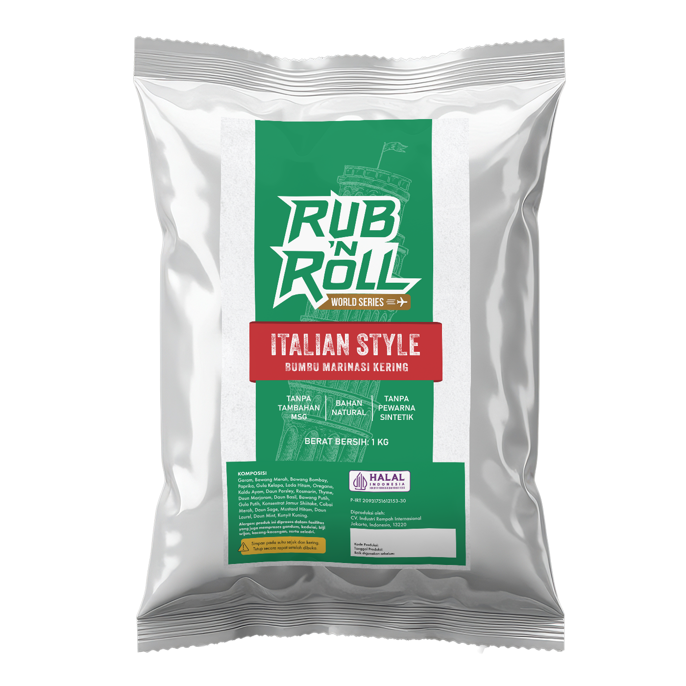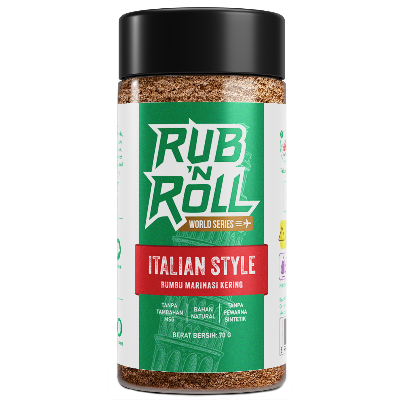 ✔ Komposisi Bumbu Marinasi Ala Italia Rub N Roll: Garam, Bawang Merah, Bawang Bombay, Paprika, Gula Kelapa, Lada Hitam, Oregano, Kaldu Ayam, Daun Parsley, Rosmarin, Thyme, Daun Marjoram, Daun Basil, Bawang Putih, Gula Putih, Konsentrat Jamur Shiitake, Cabai Merah, Daun Sage, Mustard Hitam, Daun Laurel, Daun Mint, Kunyit Kuning
