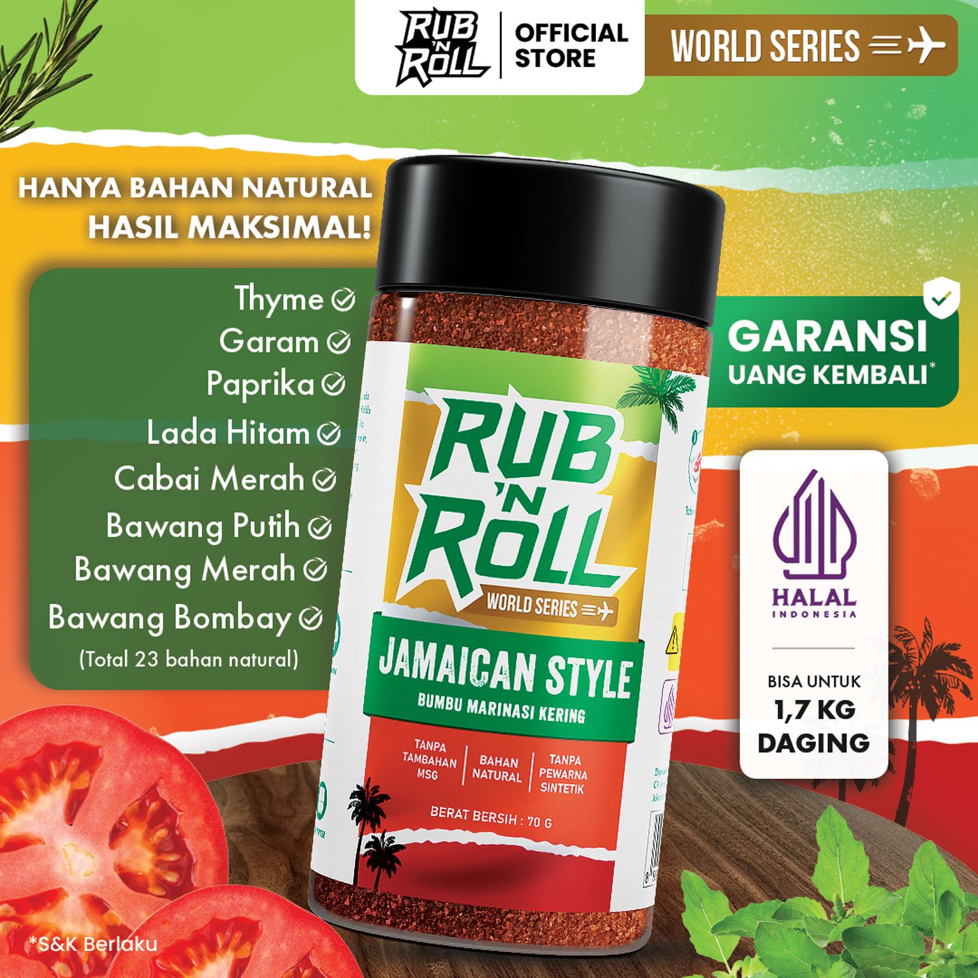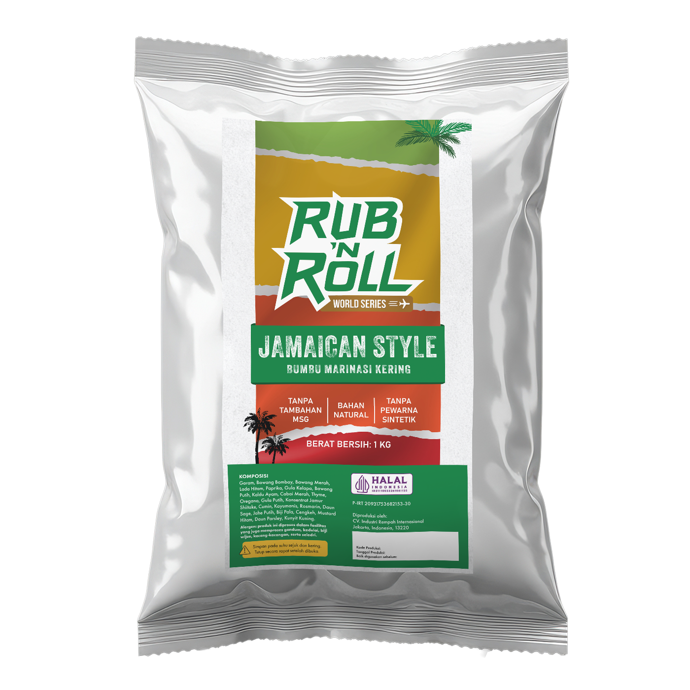 ✔ Komposisi Bumbu Marinasi Ala Jamaika Rub N Roll: Garam, Bawang Bombay, Bawang Merah, Lada Hitam, Paprika, Gula Kelapa, Bawang Putih, Kaldu Ayam, Cabai Merah, Thyme, Oregano, Gula Putih, Konsentrat Jamur Shiitake, Cumin, Kayumanis, Rosmarin, Daun Sage, Jahe Putih, Biji Pala, Cengkeh, Mustard Hitam, Daun Parsley, Kunyit Kuning