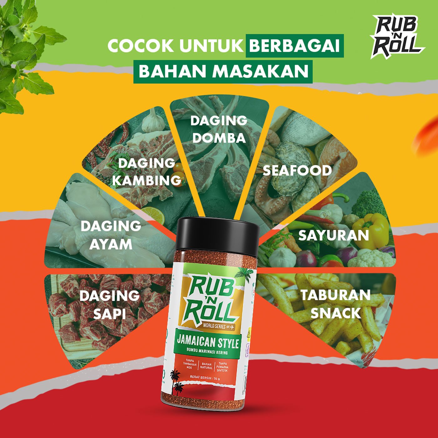 Bumbu Marinasi Ala Jamaika Rub N Roll adalah Dry Rub Premium yang terbuat dari bahan natural, tanpa tambahan MSG, pengawet, dan pewarna buatan. Upgrade rasa masakanmu jadi lebih nendang dan smoky hanya dengan satu bumbu.
