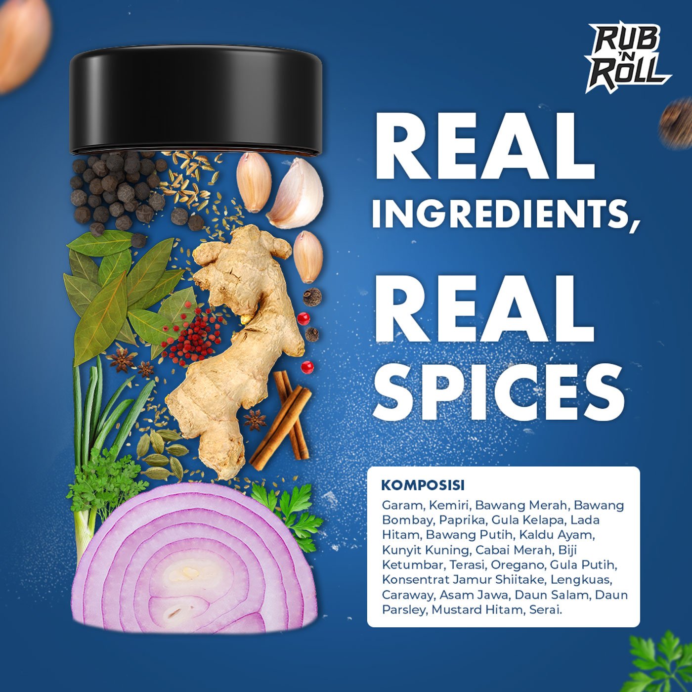 ✔ Komposisi Bumbu Marinasi Ala Jimbaran Rub N Roll: Garam, Kemiri, Bawang Merah, Bawang Bombay, Paprika, Gula Kelapa, Lada Hitam, Bawang Putih, Kaldu Ayam, Kunyit Kuning, Cabai Merah, Biji Ketumbar, Terasi, Oregano, Gula Putih, Konsentrat Jamur Shiitake, Lengkuas, Caraway, Asam Jawa, Daun Salam, Daun Parsley, Mustard Hitam, Serai