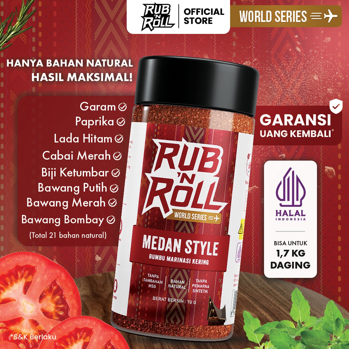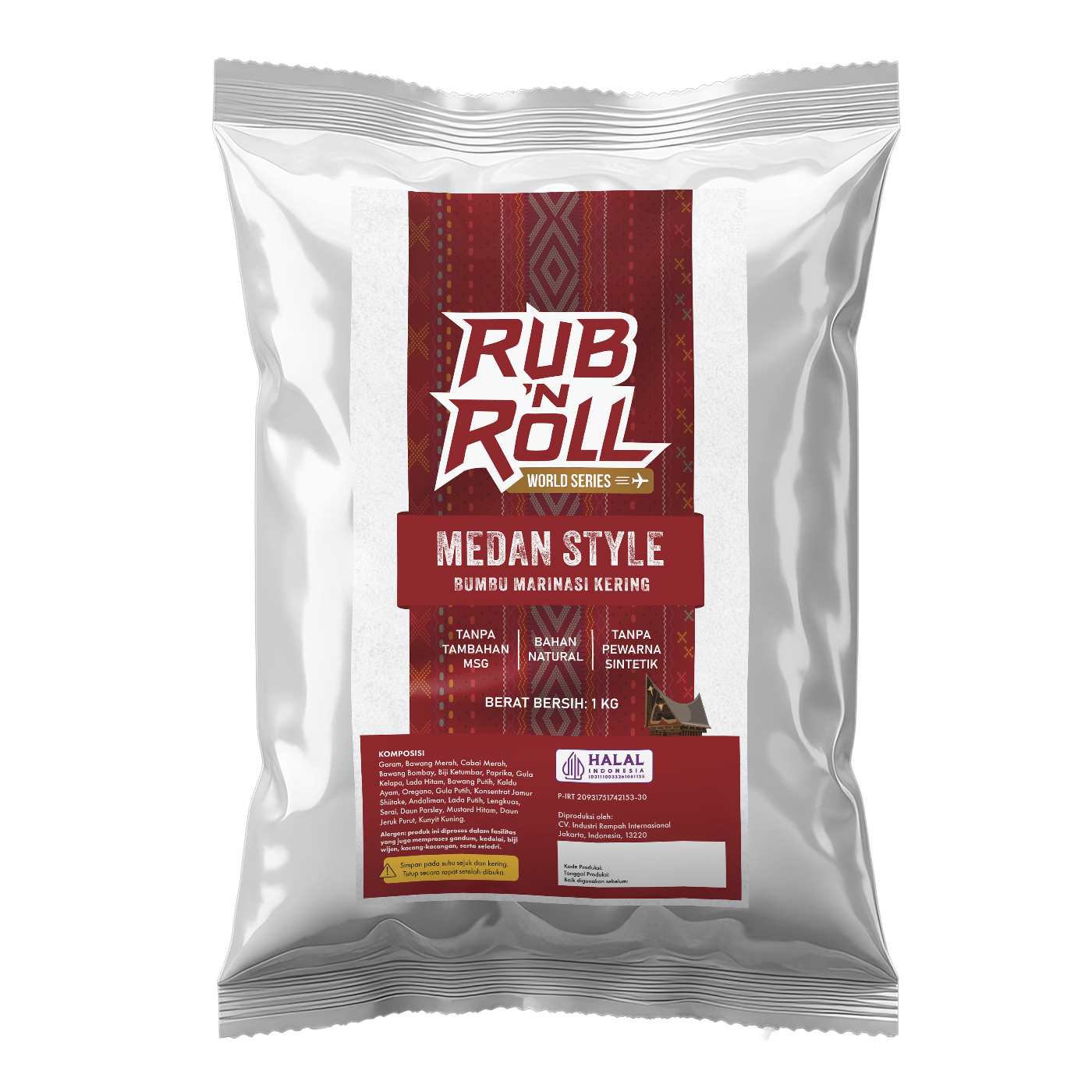 ✔ Komposisi Bumbu Marinasi Ala Medan Rub N Roll: Garam, Bawang Merah, Cabai Merah, Bawang Bombay, Biji Ketumbar, Paprika, Gula Kelapa, Lada Hitam, Bawang Putih, Kaldu Ayam, Oregano, Gula Putih, Konsentrat Jamur Shiitake, Andaliman, Lada Putih, Lengkuas, Serai, Daun Parsley, Mustard Hitam, Daun Jeruk Purut, Kunyit Kuning