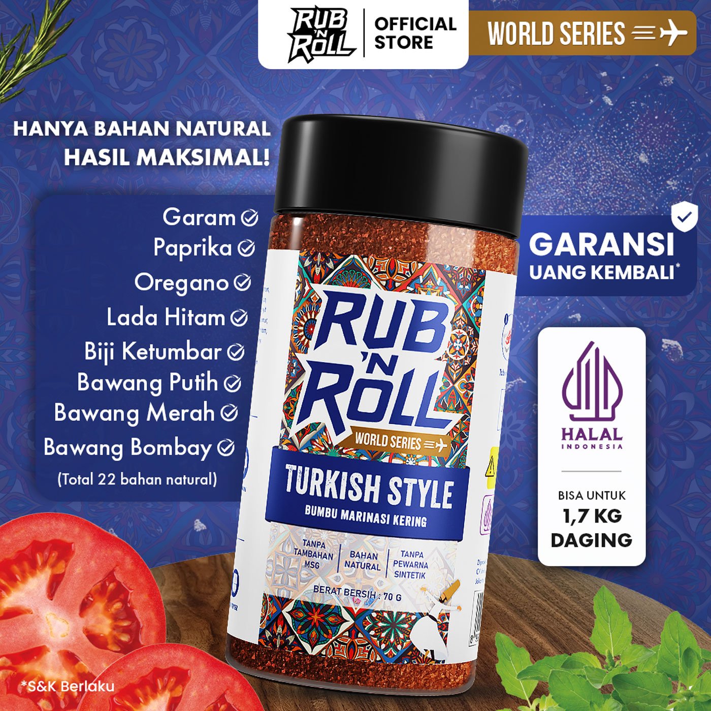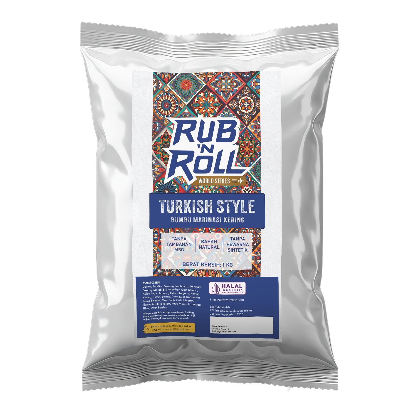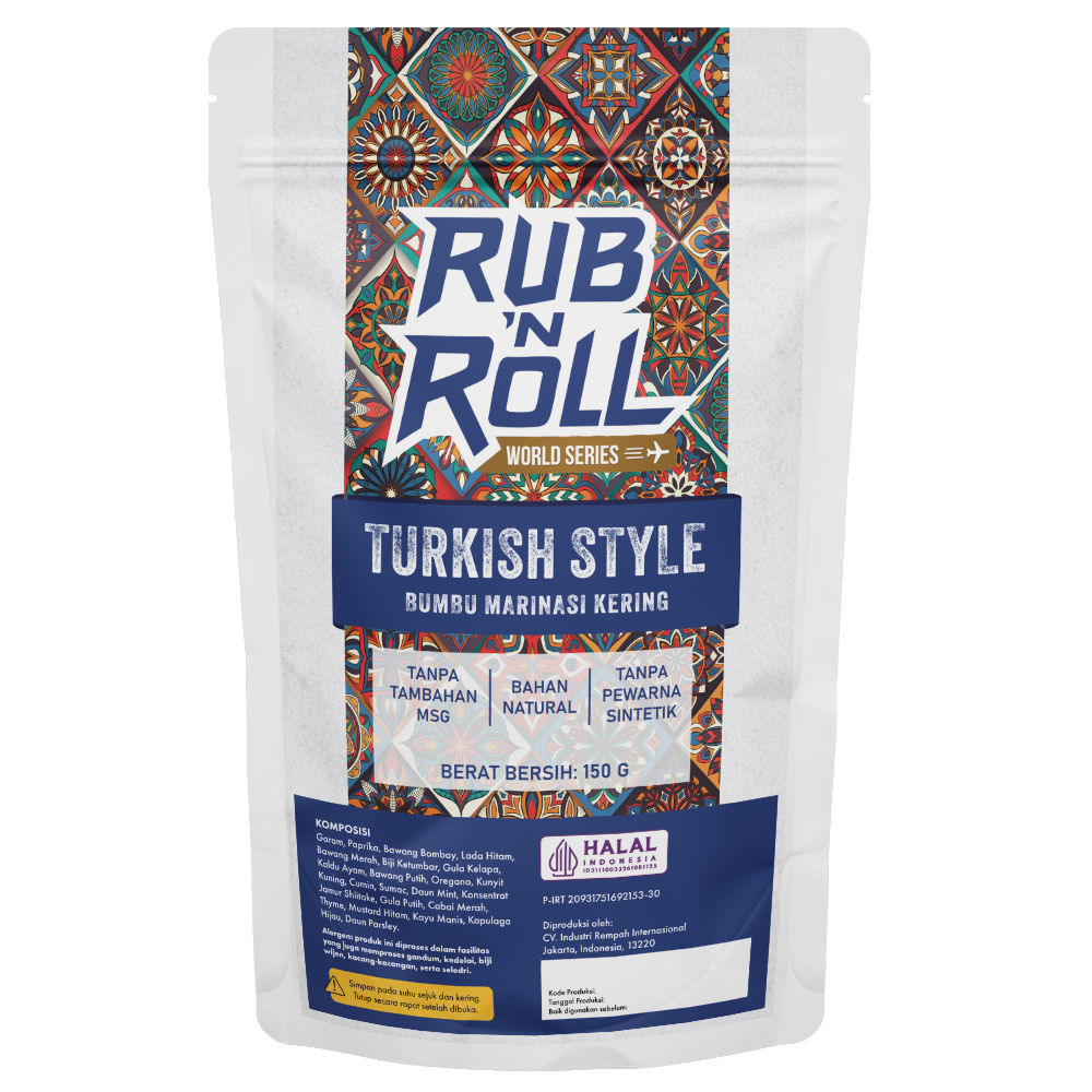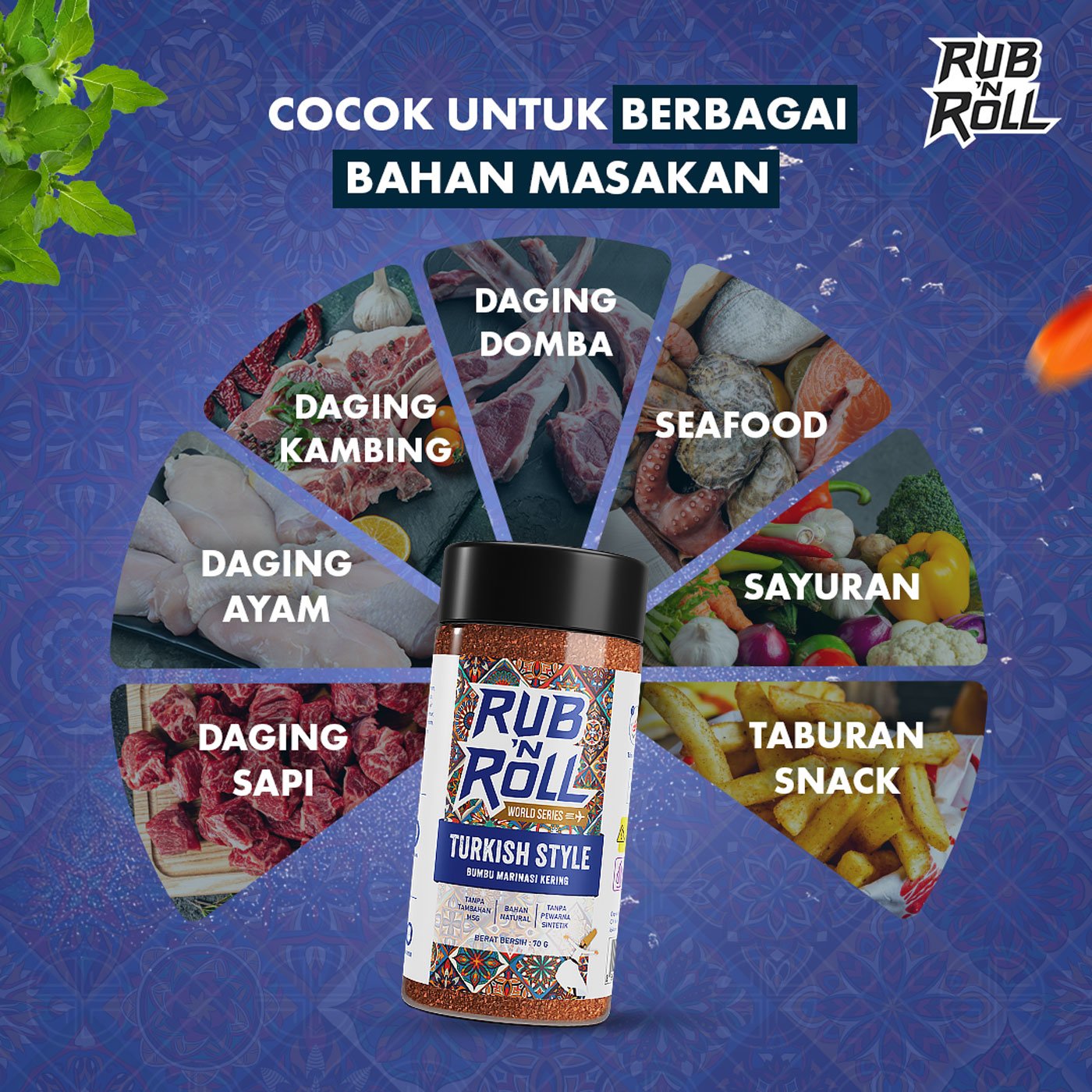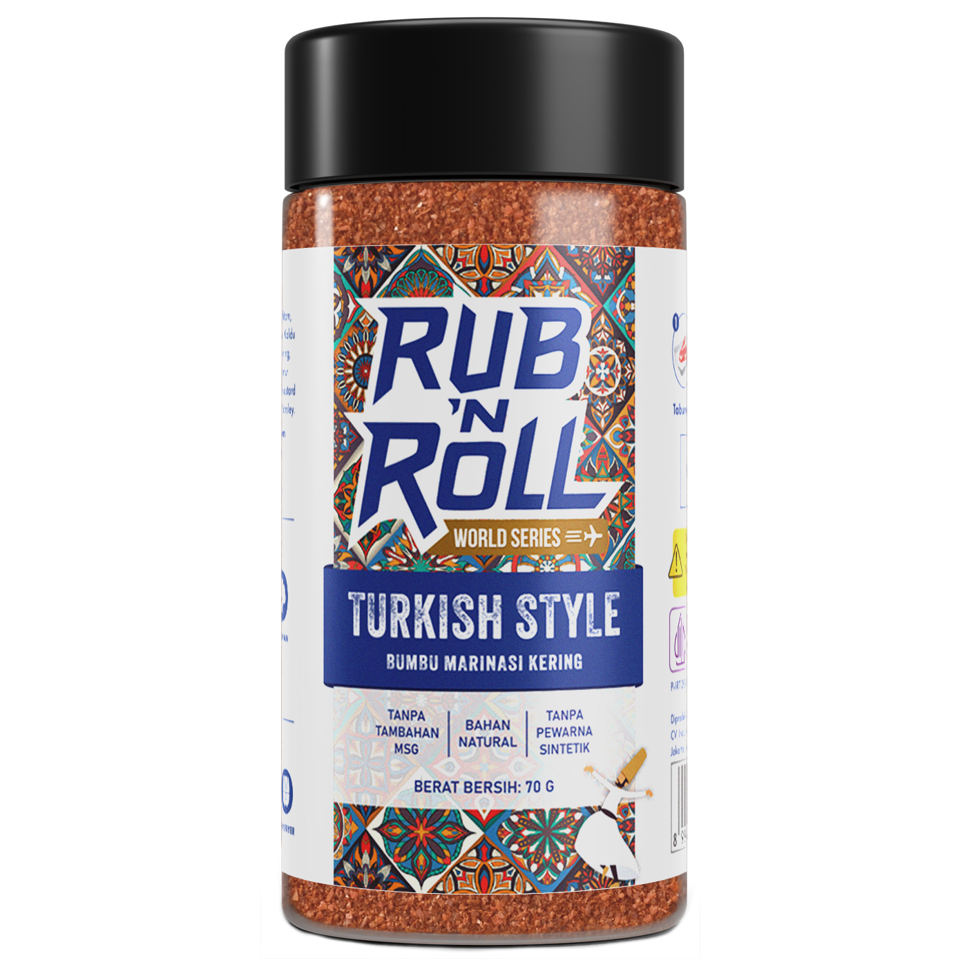 Rub N Roll menghadirkan Bumbu Marinasi Ala Turki dengan rempah hangat dan wangi khas Turki. Mudah dipadukan dengan berbagai jenis bahan masakan lainnya seperti ayam, daging, seafood, maupun sayuran. Sehingga anda bisa menghadirkan hidangan khas Turki di dapur anda dengan praktis tanpa tambahan bumbu lainnya. Bumbu ini mudah diaplikasikan dalam berbagai teknik memasak, mulai dari marinasi, panggang, tumis, hingga taburan akhir.
