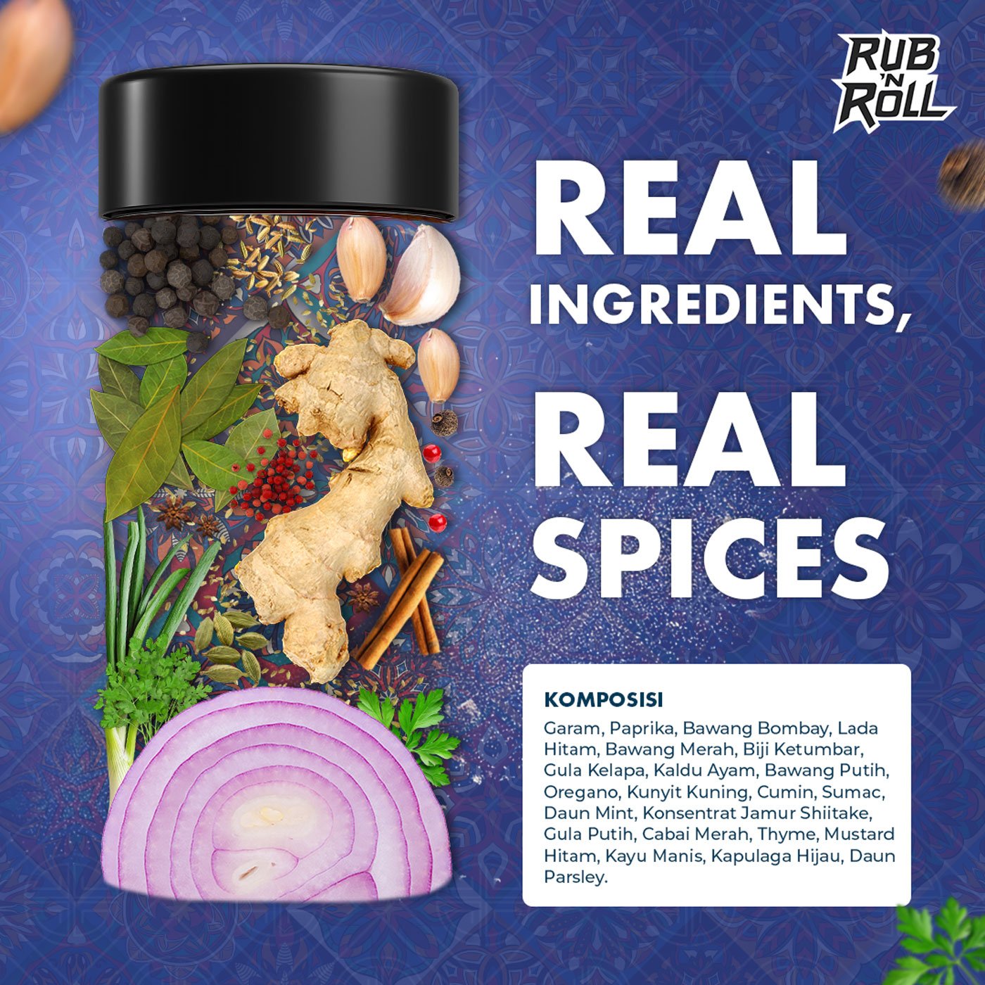 ✔ Komposisi Bumbu Marinasi Ala Turki Rub N Roll: Garam, Paprika, Bawang Bombay, Lada Hitam, Bawang Merah, Biji Ketumbar, Gula Kelapa, Kaldu Ayam, Bawang Putih, Oregano, Kunyit Kuning, Cumin, Sumac, Daun Mint, Konsentrat Jamur Shiitake, Gula Putih, Cabai Merah, Thyme, Mustard Hitam, Kayu Manis, Kapulaga Hijau, Daun Parsley