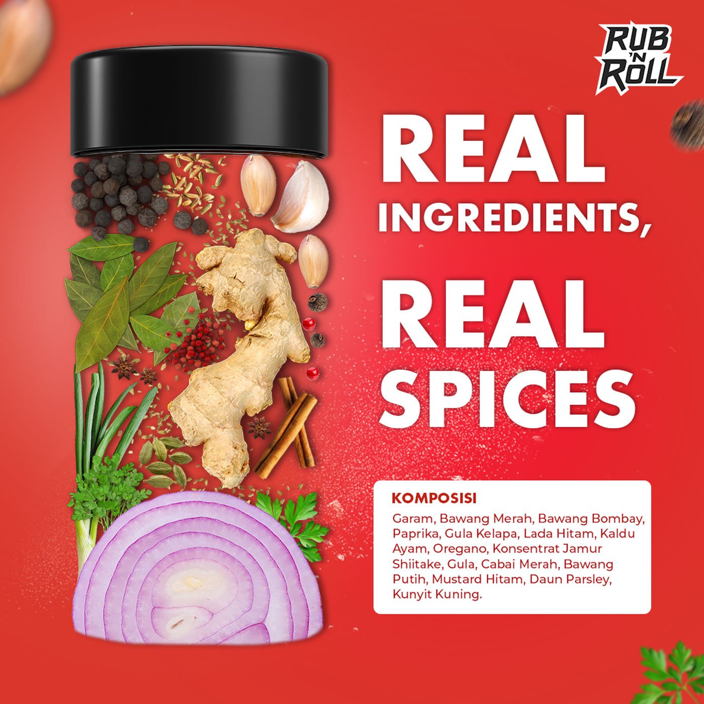 Rub N Roll menghadirkan Bumbu Marinasi Serbaguna dengan rasa gurih seimbang yang cocok untuk berbagai jenis masakan. Mudah dipadukan dengan berbagai jenis bahan masakan lainnya seperti ayam, daging, seafood, maupun sayuran. Sehingga anda bisa menghadirkan hidangan yang khas di dapur anda dengan praktis tanpa tambahan bumbu lainnya. Bumbu ini mudah diaplikasikan dalam berbagai teknik memasak, mulai dari marinasi, panggang, tumis, hingga taburan akhir.